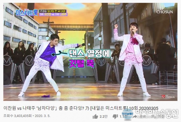 [아시아뉴스통신=이상진 기자] 가수 이찬원과 나태주가 '미스터트롯'에 출연해 '남자다잉'을 열창한 영상이 340만 뷰를 돌파했다.