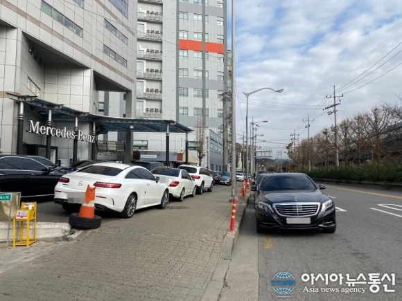| 2일 오후 서울 마포구 모래내로에 위치한 한성자동차 메르세데스벤츠 성산서비스센터. 벤츠 차량들이 인도 위나 주차장이 아닌 곳에 주정차 되어있다. 한편 현행법상 불법주·정차를 했을 경우 과태료를 부과하게 된다./아시아뉴스통신 황준수 기자 |