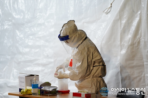 | 강릉시보건소 선별진료소에서 코로나 19 검체 검사 전 사전 작업을 하고 있는 검사요원./아시아뉴스통신=조이호기자 |