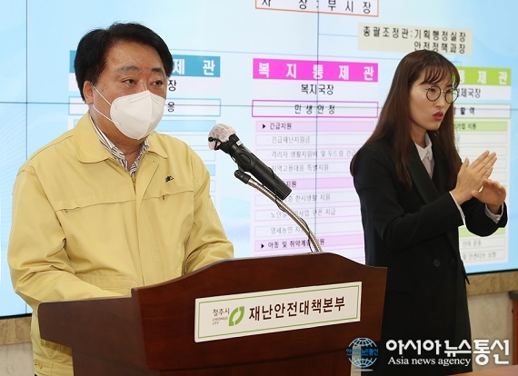 | 한범덕 청주시장이 시청 재난안전대책본부에서 오창읍 코로나19 연쇄감염 관련 대시민담화를 발표하고 있다./아시아뉴스통신DB |