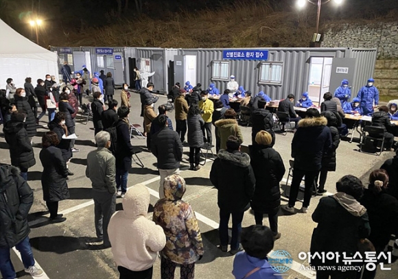 | 강릉 코로나 40번 환자와 관련되 검사를 받기 위해 줄서 있는 강릉 시민들./사진=강릉시청 |