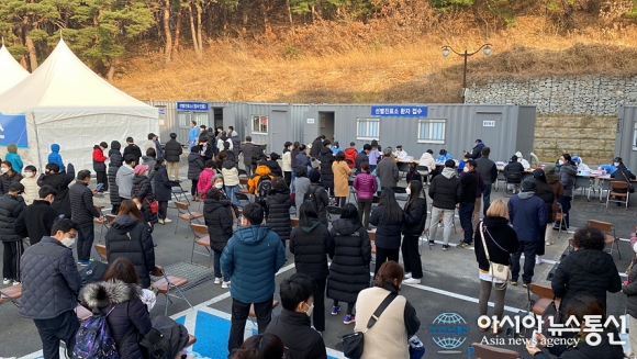 | 11일, 강릉시에 유치원생 포함 확진환자가 15명 발생해 확진환자와 연관된 시민들이 강릉시보건소 선별진료소에 검사를 받기 위해 대기 하고 있다./아시아뉴스통신=조이호기자 |