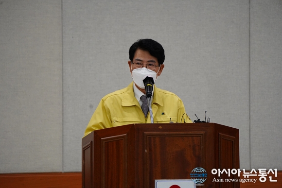 | 김한근 강릉시장이 11일 오후 2시 시청 대회의실에서 지역 내 코로나 19 확진자의 대량 발생으로 긴급 기자회견을 가졌다. 김시장은 회견에서 사회적 거리두기 2.5로의 격상과 1주일간 '강릉 멈춤' 동참을 호소했다./아시아뉴스통신=조이호기자 |