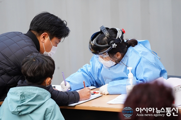 | 강릉시가 강화된 거리두기 2.5단계를 11일부터 17일까지 시행하고 ‘강릉 멈춤’ 동참을 시민들에게 강력히 호소하고 있다. 사진은 11일 코로나 검사를 받기 위해 강릉시보건소 선별진료소에서 아빠와 함께 검사지를 작성하고 있는 어린이./아시아뉴스통신=조이호기자 |