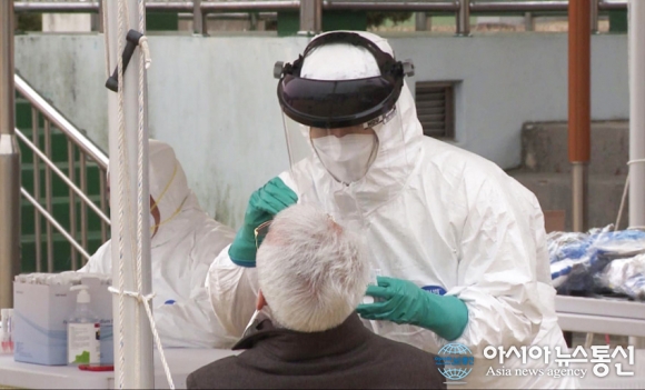 | 13일 전국적으로 코로나19 감염병 환자가 1000명 넘게 발생한 가운데 강릉시는 옥계 목욕탕에서 시작된 감염 고리 차단 위해 옥계초등학교에 임시선별진료소를 설치해 옥계면 주민 전체를 대상으로 코로나 19 진단검사를 실시하고 있다. 사진은 코로나19 진단 검사를 받고 있는 옥계면 주민./사진제공=강릉시청 |