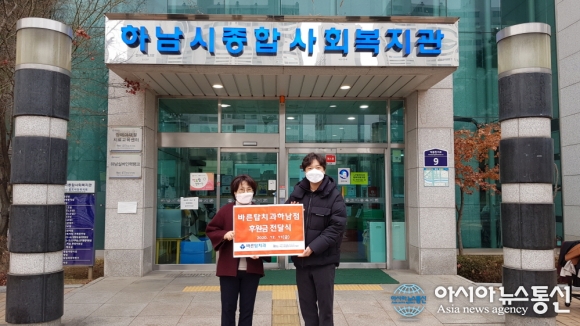 | 하남바른탑치과에서 하남시종합사회복지관에 후원금을 전달했다./아시아뉴스통신 DB |