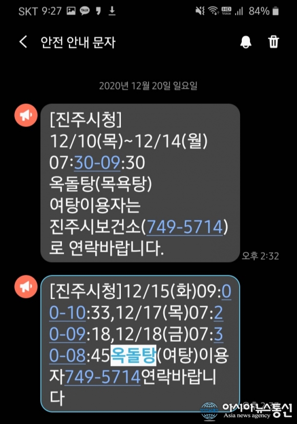 한편 진주시청은 20일 안전 안내 문자를 통해 12월10일~14일, 15일, 17일, 18일 옥돌탕(여탕) 이용자는 진주시보건소로 연락바란다는 메시지를 발송했다.