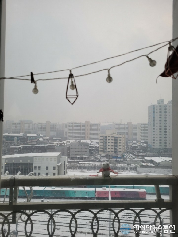 12일 오후 서울 북가좌동에 위치한 한 아파트 베란다에 귀여운 눈사람이 있다./아시아뉴스통신=서인석 기자