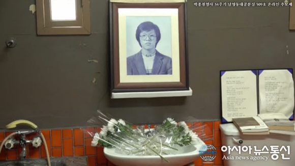 | 14일 서울 용산구 민주인권기념관에서 박종철 열사 사망 34주기를 맞아 박종철 열사의 온라인 추모제가 열렸다. 사진은 박종철 열사가 생전에 물고문을 당한 옛 남영동 대공분실 509호에 놓여 있는 박 열사의 영정 모습이다. (사진출처=민주열사 박종철기념사업회 유트브 화면) |