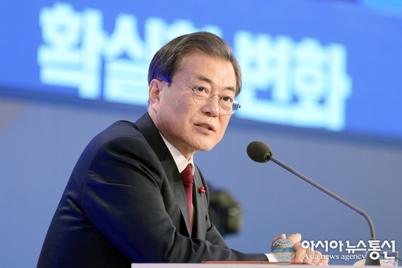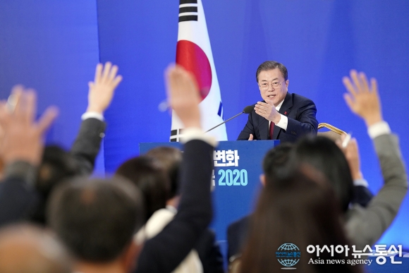 | 지난해 1월 14일 문재인 대통령이 청와대 영빈관에서 열린 신년기자회견에 참석해 출입기자들의 질문을 받은 후 국정운영 방향을 답하고 있는 모습이다./아시아뉴스통신DB |