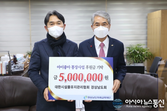 [아시아뉴스통신=최광열 기자] 경상남도미래교육재단(이사장 박종훈 교육감)은 19일 대한시설물유지관리협회 경상남도회(회장 노철효)가 교육감실을 방문, ‘아이좋아 통장사업’ 후원금 500만원을 기탁했다고 밝혔다.