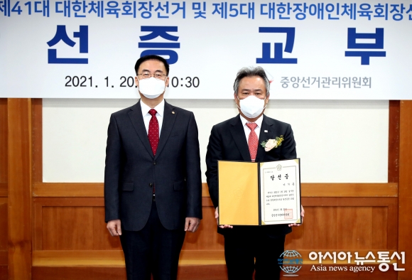 이기흥 대한체육회장이 20일 중앙선거관리위원회 과천청사에서 제41대 대한체육회장 당선증을 교부받았다.