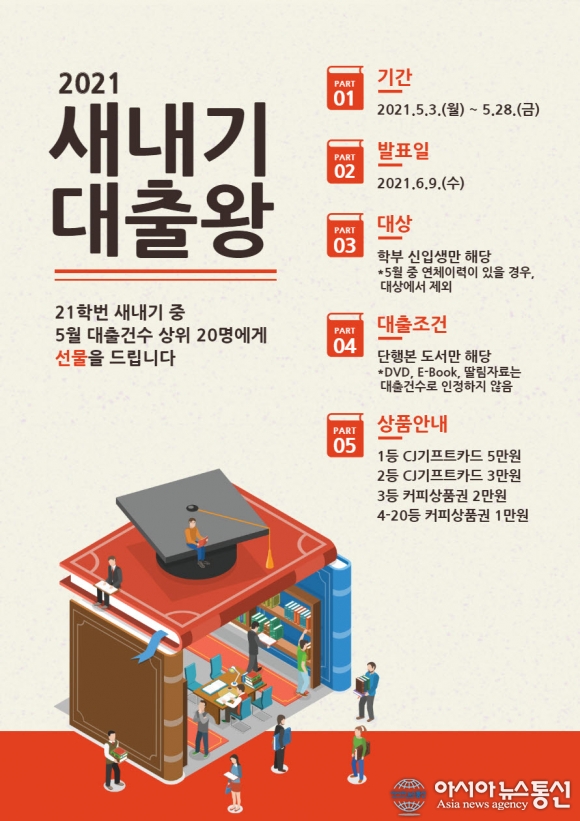 | 대전대학교 중앙도서관이 신입생들의 도서관 이용률 증대를 위해 ‘2021 새내기 대출왕’ 선발이벤트를 진행한다. |