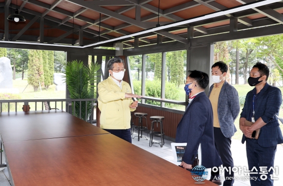 | 29일 정용래 유성구청장이 유림문화공원을 방문해 대형 파고라 점검을 실시하고 있다./아시아뉴스통신 DB |
