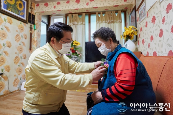 | 오세현 아산시장이 제49회 어버이날 기념 어르신 댁을 방문하고 카네이션 달아드리고 있다.(사진제공=아산시) |