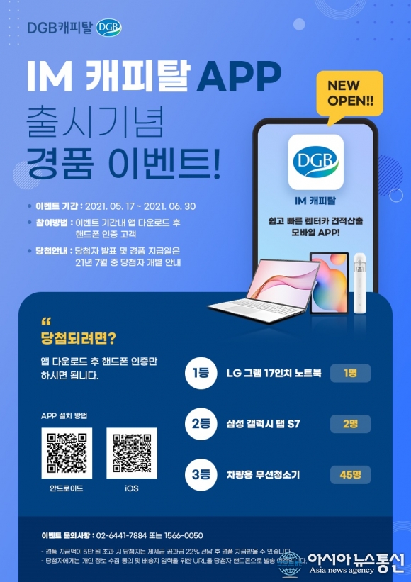 [아시아뉴스통신=윤석원 기자] DGB캐피탈(대표 서정동)은 렌터카 견적산출 모바일 플랫폼인 'IM캐피탈' 출시를 기념해 오는 6월30일까지 경품 이벤트를 진행한다.