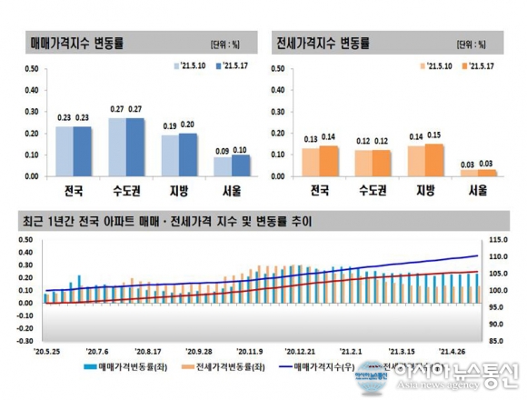 한국부동산원(원장 손태락)이 5월 3주(17일 기준) 전국 주간 아파트가격 동향을 조사한 결과, 매매가격은 0.23% 상승, 전세가격은 0.14% 상승했다.