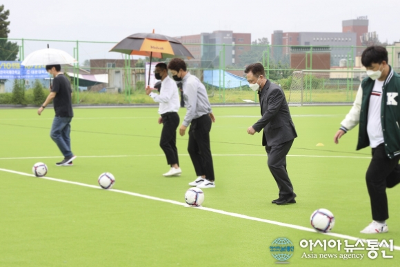 | 경일대학교 축구장 리모델링 개장식이 3일 열려 정현태 총장(오른쪽 두 번째)이 시축을 하고 있다.(사진제공=경일대학교) |