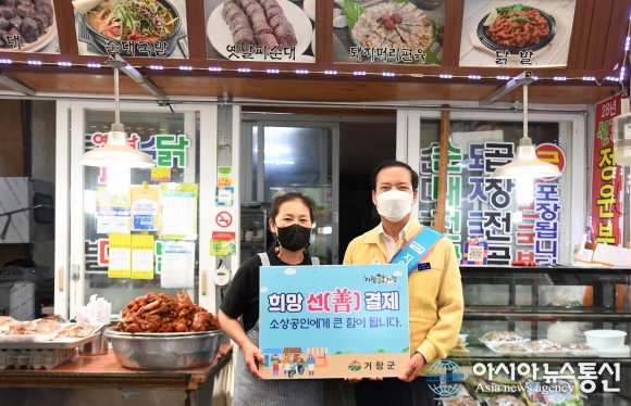 | 16일 구인모 거창군수가 추석을 앞두고 거창전통시장 방역상황을 점검한 후 ‘희망 선결제 캠페인’에 동참하고 있다.(사진제공=거창군청) |