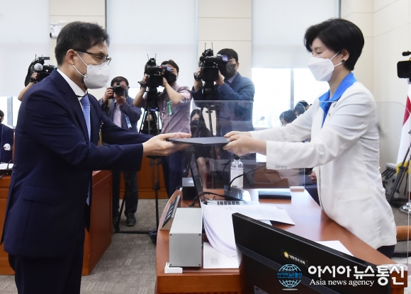 | 한기정 공정거래위원회 위원장 후보자가 2일 서울 여의도 국회 열린 국회 정무위원회에서 열린 인사 청문회에서 선서문를 전달 하고 있다.(공동사진취재) |