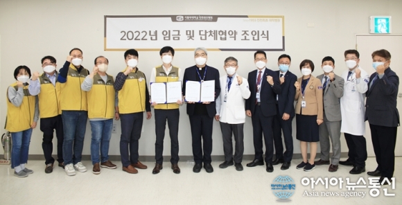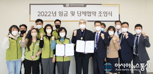 [아시아뉴스통신=양행복 기자] 가톨릭대학교 인천성모병원(병원장 홍승모 몬시뇰)은 지난 10일과 17일 전국의료산업노동조합연맹 인천성모병원 노동조합(위원장 표순열), 전국보건의료산업노동조합(위원장 나순자)과 각각 2022년 임금 및 단체협약 조인식을 시행했다고 17일 밝혔다.