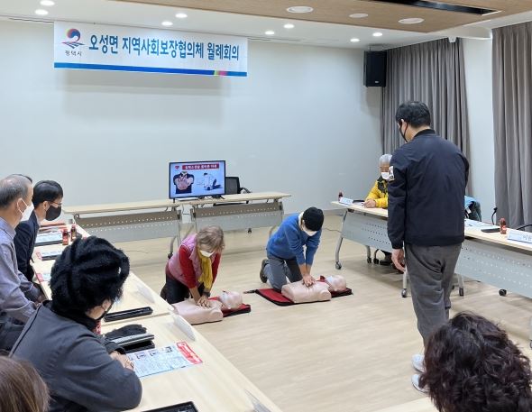 평택시 오성면 지역사회보장협의체는 지난 1일 2022년을 마무리하는 월례회의를 개최하면서 심폐소생술 교육을 함께 진행했다.