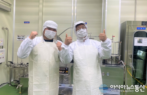 | 창원특례시 청년농업인연합회 6차 산업분과 이찬희 대표 등이 지역 대표 특산물 개발을 위한 가공시설에서 포즈를 취하고 있다.(사진제공=창원시청) |