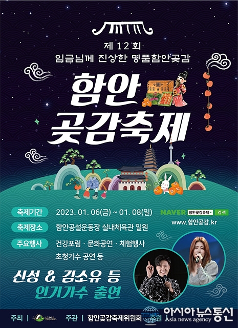 [아시아뉴스통신=이미내 기자] 임금님도 반한 명품 함안곶감을 만날 수 있는 '제12회 함안곶감축제'가 오는 1월 6일부터 8일까지 3일 간 함안체육관 일원에서 열린다. 코로나19 상황으로 제9회 축제 이후 온라인으로 개최됐으나, 3년 만에 오프라인 축제를 열게 됐다.