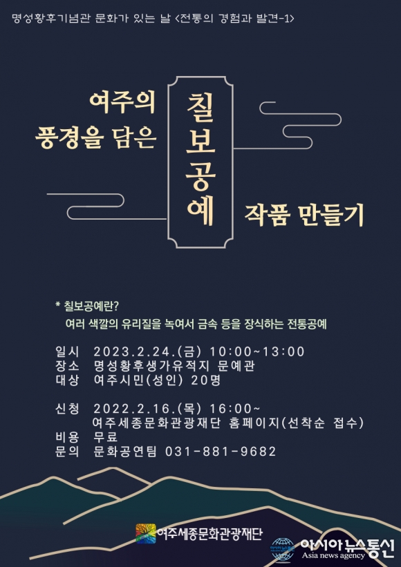 [아시아뉴스통신=박성근 기자]여주세종문화관광재단은 오는 24일, 명성황후기념관 2월 문화가 있는 날 프로그램으로‘여주의 풍경을 담은 칠보공예 작품 만들기’를 진행한다.