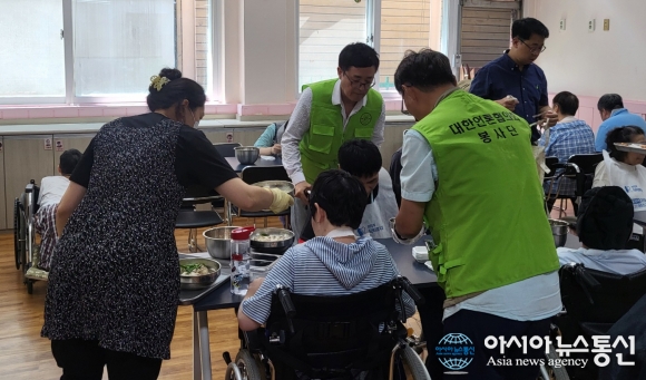 [아시아뉴스통신=박신웅 기자] 29일 대한언론협의회 중앙회와 의정부파워라이온스클럽이 공동으로 경기 의정부시 녹양동에 위치한 장애인 주.단기 보호시설(곰두리네집)을 찾아 삼계탕 봉사에 나서 지역사회에 훈훈함을 더해 주고 있다.
