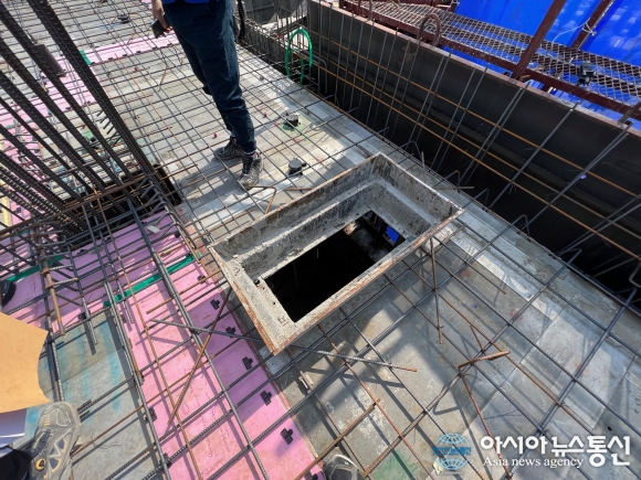 | 무량판 슬래브 철근배근과 개구부 주변 전단보강근 설치 검측 장면./사진제공=SH공사 |