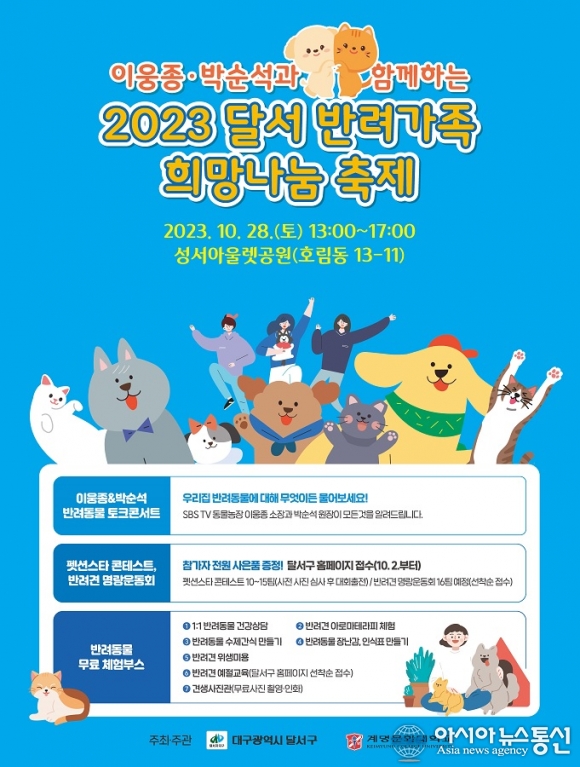 대구 달서구와 계명문화대학교 LINC3.0사업단은 오는 28일 오후 1시 성서아울렛 근린공원에서 '2023 달서 반려가족 희망나눔 축제'를 공동으로 개최한다.