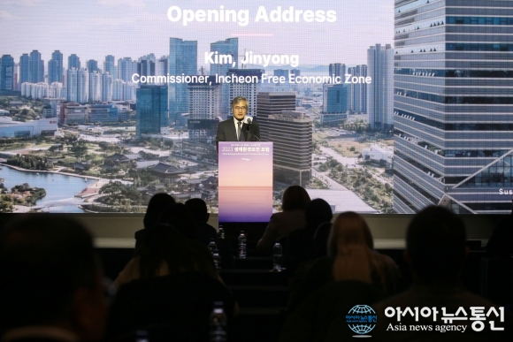 | 지난달 30일 송도 경원재앰배서더호텔에서 열린 ‘2023 생태환경보전 포럼’에서 김진용 인천경제자유구역청장이 인사말을 전하고 있다.(사진=인천경제자유구역청) |