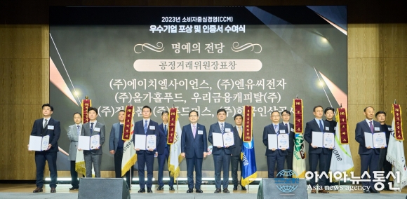 | 8일 공정거래위원회와 한국소비자원 주최로 서울 잠실 롯데호텔월드에서 열린 ‘2023년 소비자중심경영(CCM) 우수 기업 포상 및 인증서 수여식’에서 ㈜푸드머스 천영훈 대표(사진 앞줄 왼쪽 일곱번째 ), ㈜올가홀푸드 강병규 대표(사진 앞줄 왼쪽 세번째)가 ‘CCM 명예의 전당’ 표창을 받은 후 한기정 공정거래위원장(사진 앞줄 왼쪽 네번째), 수상 기업 대표들과 기념 촬영을 하고 있다.(사진제공=풀무원) |
