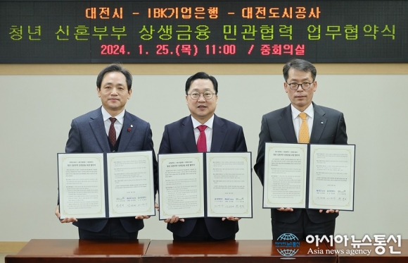 [아시아뉴스통신=최정현 기자] 대전시와 IBK기업은행(이하 기업은행), 대전도시공사(이하 도시공사)가 무주택 청년 신혼부부의 주거안정 지원을 위해 힘을 모았다.
