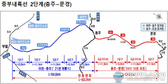 [아시아뉴스통신=최정현 기자] 국가철도공단 충청본부는 중부내륙선 2단계(충주~문경) 구간(39.2km)의 주요 공사를 완료하고 올해 10월 개통을 목표로 오는 28일부터 열차운행시험을 위한 전기(2만5천V)를 공급한다고 밝혔다.