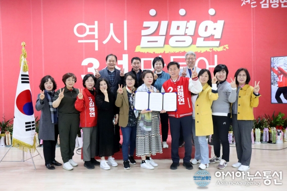 | 지난 8일 국민의힘 제22대 경기 안산시(병)에 출마한 김명연 후보가 윤인숙 한국공인중개사협회 단원구지회장과 정책연대 협약을 체결하고 회원들과 단체기념 사진을 촬영하고 있다.사진제공=김명연 후보 사무실 |