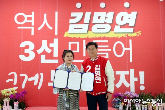 | 지난 8일 국민의힘 제22대 경기 안산시(병)에 출마한 김명연 후보가 윤인숙 한국공인중개사협회 단원구지회장과 정책연대 협약을 체결하고 기념 사진을 촬영하고 있다.사진제공=김명연 후보 사무실 |