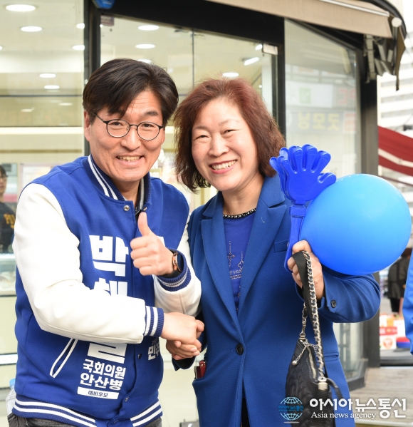| 9일 오후 더불어민주당 제22대 총선 경기 안산병에 출마한 박해철 후보가 동명상사 삼거리에서 마지막 유세를 펼치고 한 지지자 여성과 기념 사진을 촬영하고 있다.아시아뉴스통신=신영철 기자 |