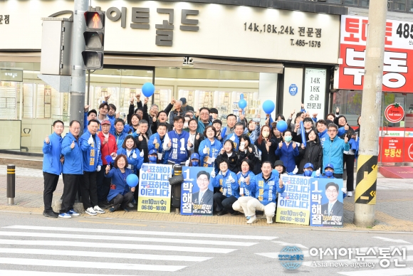 | 9일 오후 더불어민주당 제22대 총선 경기 안산병에 출마한 박해철 후보가 동명상사 삼거리에서 마지막 유세를 펼치고 지지자와 선거운동원들과 기념 사진을 촬영하고 있다.아시아뉴스통신=신영철 기자 |