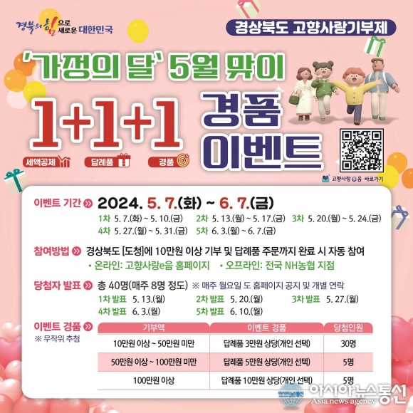 [아시아뉴스통신=김상범 기자] 경북도는 5월 가정의 달을 맞아 고향사랑기부제에 대한 관심을 높이고 기부 시기 분산, 기부자의 만족도를 올리는 1+1+1 경품 이벤트를 진행한다.