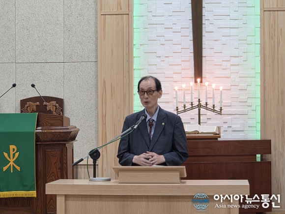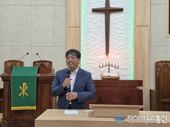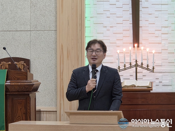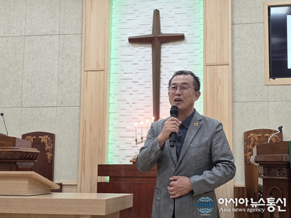 | 장명석 원포교회 담임 목사가 환영사를 하고 있다. |