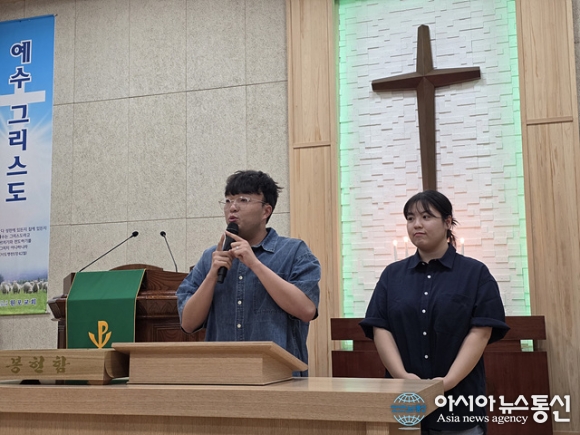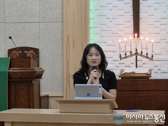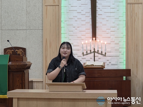 | 박지혜 청년이 간증을 하고 있다. |