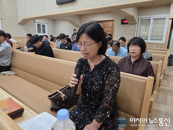 | 손정옥 사모가 대표 기도를 하고 있다. |