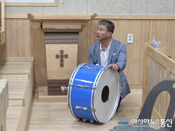 | 박상진 장로가 악기를 다루며 찬송을 부르고 있다. |