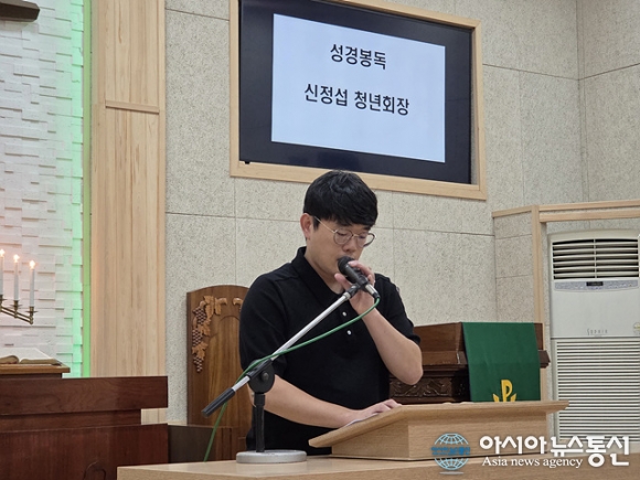 | 심정섭 청년 회장이 성경봉독을 하고 있다. |