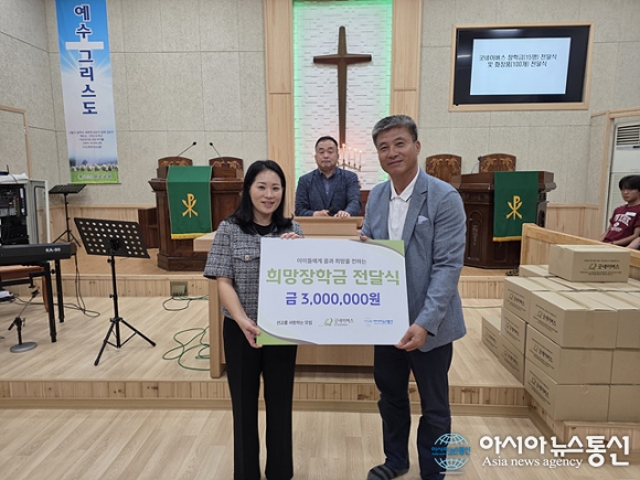 | 김나희 굿네이버스 국장(왼쪽)이 박상진 장로에게 희망장학금을 전달하고 있다. |