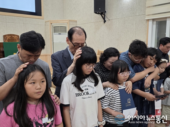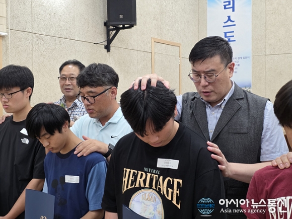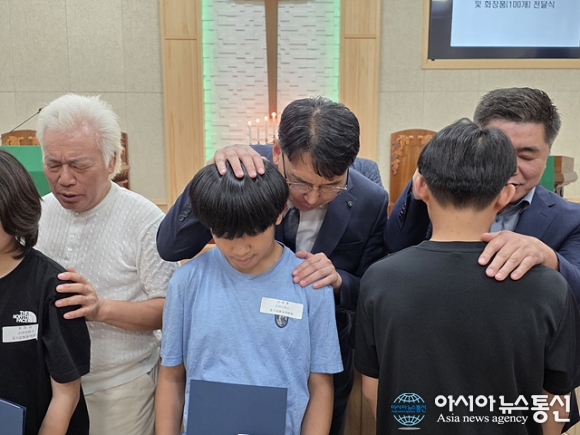 | 김용식 신광교회 목사와 장세희 장로 및 선사모 회장이 기도를 하고 있다. |