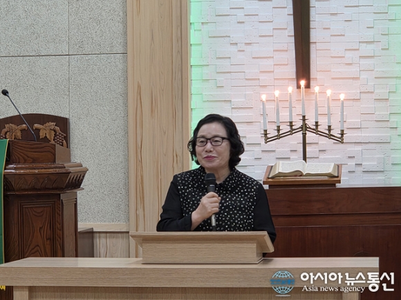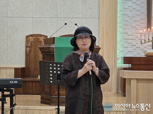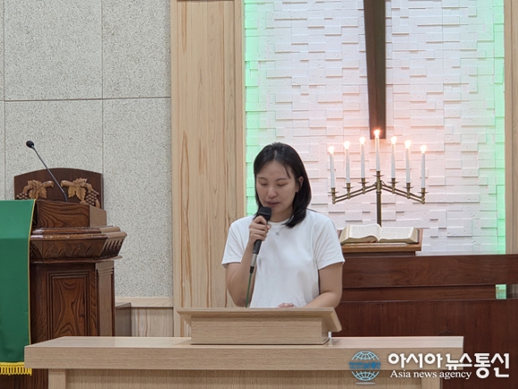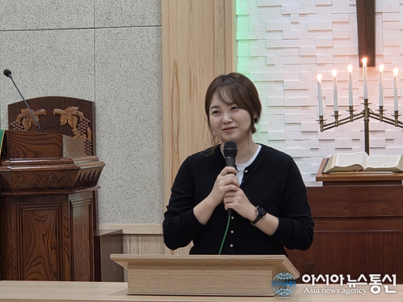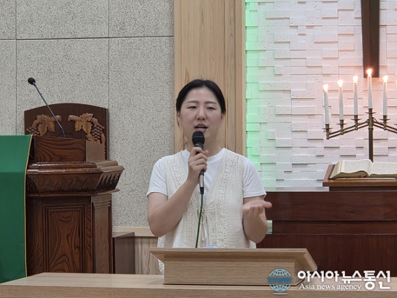 | 윤한나 사모가 간증을 하고 있다. |