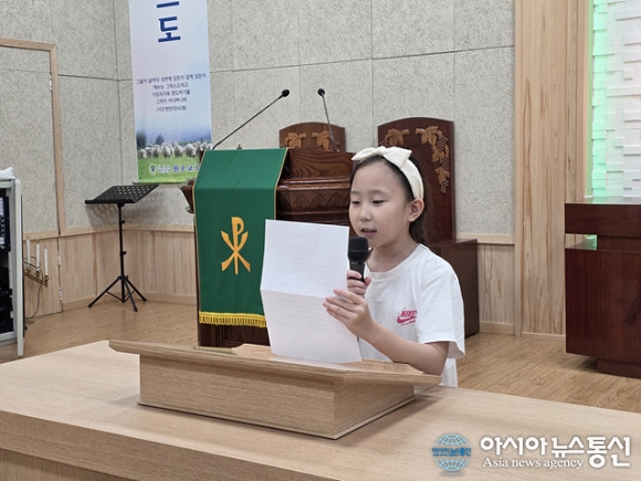 | 김은채 어린이가 간증을하고 있다. |
